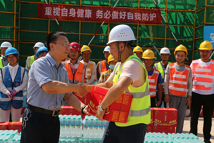 8月26日至27日,集團(tuán)監(jiān)事會(huì)主席陳孝榮、黨委副書記黃家偉、財(cái)務(wù)總監(jiān)梁曉斌等帶隊(duì),分成5個(gè)慰問組,分別來到蟠龍大橋、鳳崗嘉苑住宅小區(qū)、人才小鎮(zhèn)住宅小區(qū)一期等工程項(xiàng)目工地走訪慰問高溫作業(yè)一線職工,為他們發(fā)放西瓜、涼茶、礦泉水等解暑物品,送來一絲清涼;關(guān)心詢問他們的身體情況和工作困難,囑咐他們?cè)诟邷毓ぷ鲿r(shí)勞逸結(jié)合、自我調(diào)節(jié),建立、落實(shí)錯(cuò)時(shí)工作制,做到合理安排工作時(shí)間,盡可能避開高溫時(shí)段,防止高溫中暑,確保施工安全和身體健康。工程管理公司、生態(tài)投資公司有關(guān)負(fù)責(zé)人以及集團(tuán)工會(huì)、文化宣傳部相關(guān)人員參加慰問。