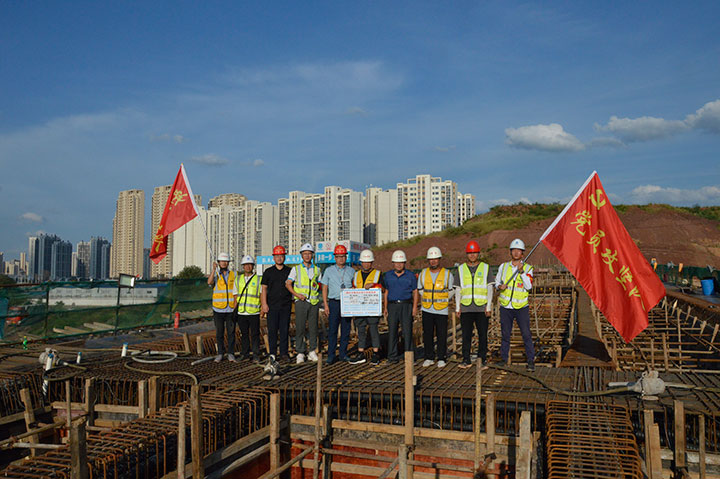 蟠龍大橋項目橋梁工程全長1376米,由南北引橋工程和主橋工程組成,其中引橋工程有九聯(lián)預應力現(xiàn)澆箱梁(980米),主橋工程有一聯(lián)單索面三塔雙層鋼桁梁(396米),本次首聯(lián)現(xiàn)澆箱梁橋面寬16.5米、高度2米、混凝土用量1593方,施工采用盤扣式滿堂支架技術措施。據(jù)悉,考慮到本次混凝土澆筑方量大、體積大、砼標號高、高溫氣候等技術因素及支模架危險性較大工程等安全因素,臨時黨支部充分運用學習交流、溝通協(xié)調機制,積極組織參建各方對支模架安全技術方案進行了專家論證評審,確保施工安全可靠、技術可行,并提前到商品混凝土攪拌站開展溝通協(xié)調,掌握原材料質量及倉庫儲備數(shù)量,提前做好夜間值班分工、后勤保障服務工作,確保箱梁澆筑順利完成。