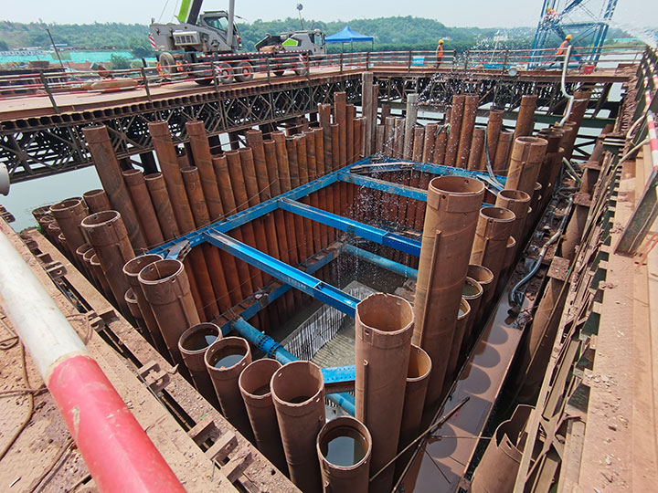 蟠龍大橋主橋涉水施工措施是技術(shù)難點(diǎn)、重要性節(jié)點(diǎn)、施工危險(xiǎn)性較大工程之一,主要技術(shù)難點(diǎn)在于水中墩柱承臺(tái)的圍堰施工,針對(duì)薄覆蓋層硬質(zhì)河床、承臺(tái)入巖等水文地質(zhì)、設(shè)計(jì)要求,工程管理公司黨總支在蟠龍大橋項(xiàng)目成立黨員先鋒隊(duì)攻堅(jiān)小組,精心組織、知難而上、勇于探索,在水中P17#、P18#墩采用了“成套鎖扣鋼管樁(φ630)+全套管全回轉(zhuǎn)鉆引孔開(kāi)槽+清槽嵌固+封底”的圍堰方案,成功破解了項(xiàng)目建設(shè)中,水中薄覆蓋層硬質(zhì)河床引孔開(kāi)槽、鋼管樁搭設(shè)鎖扣、反循環(huán)清槽、細(xì)石混凝土封槽、鎖扣止水等技術(shù)難點(diǎn)。