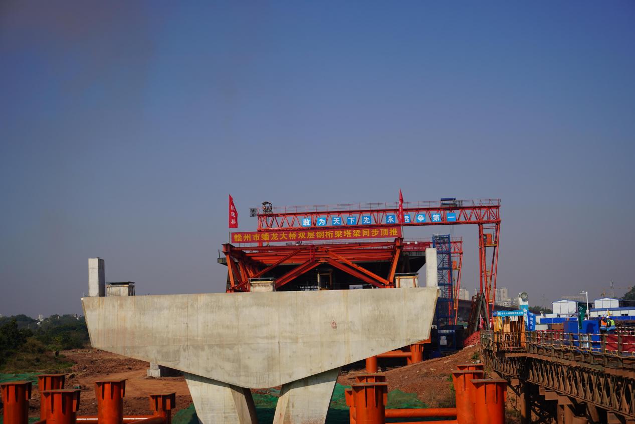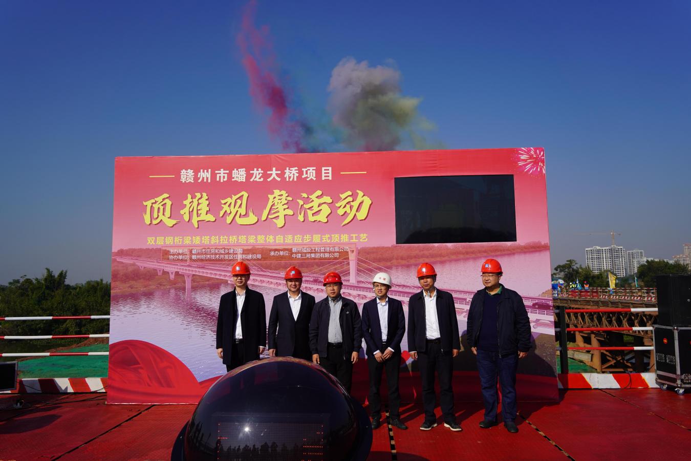 12月6日,贛州市蟠龍大橋項目主橋鋼結(jié)構(gòu)首次頂推啟動,為主橋的順利推進(jìn)打下堅實基礎(chǔ),標(biāo)志著該項目取得了全市重點項目建設(shè)百日攻堅活動任務(wù)目標(biāo)的節(jié)點性勝利。贛州經(jīng)濟(jì)技術(shù)開發(fā)區(qū)住房和建設(shè)局,贛州城投工程管理公司、中建三局總承包公司等參建各單位代表共計60余人參加頂推啟動活動。