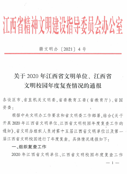 近日,江西省文明辦印發(fā)《關于2020年江西省文明單位、江西省文明校園年度復查情況的通報》(贛文明辦[2021]4號),贛州城投集團順利通過2020年省級文明單位年度復查,繼續(xù)保留“第十五屆江西省文明單位”稱號。