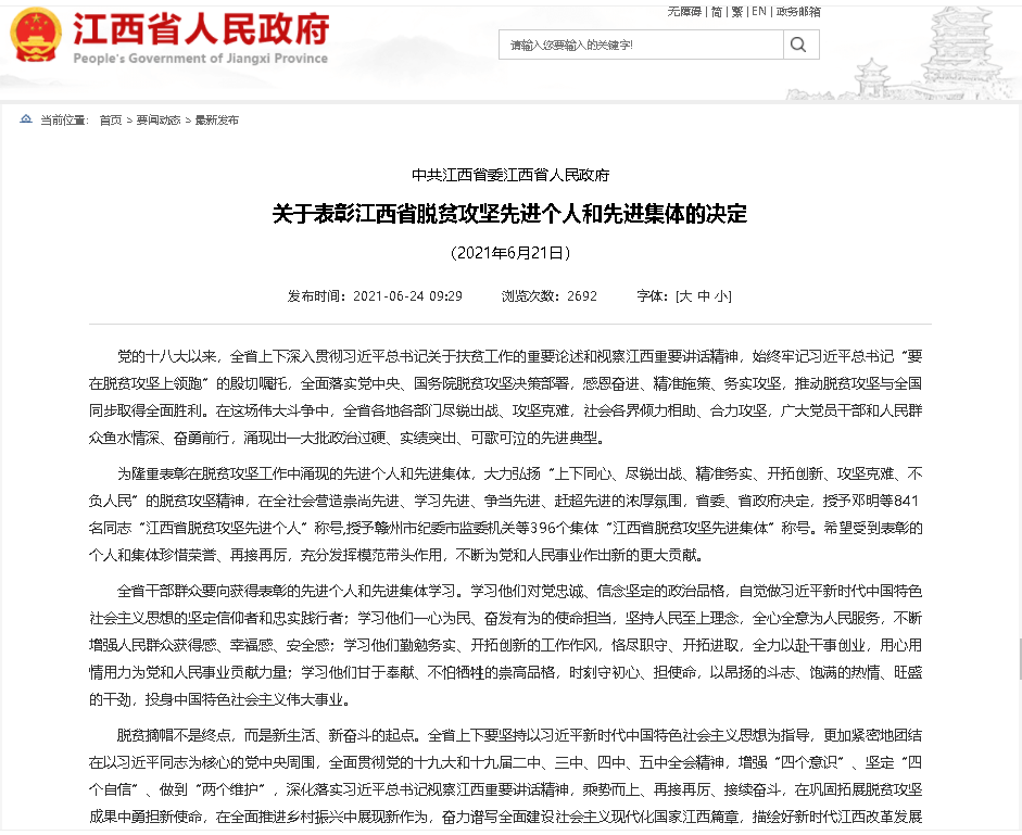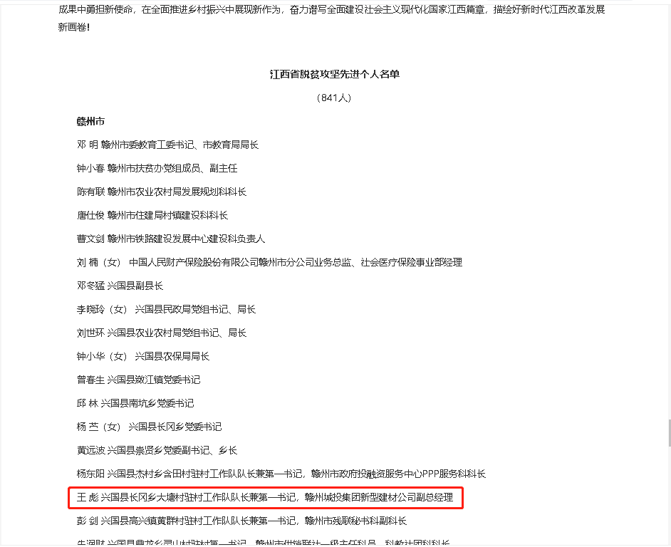 6月23日,省委、省政府召開全省脫貧攻堅(jiān)總結(jié)表彰大會(huì),表彰一批在打贏脫貧攻堅(jiān)戰(zhàn)中作出突出貢獻(xiàn)的個(gè)人和集體,其中,興國(guó)縣長(zhǎng)岡鄉(xiāng)大塘村駐村工作隊(duì)隊(duì)長(zhǎng)兼第一書記,贛州城投集團(tuán)新型建材公司副總經(jīng)理王彪獲“江西省脫貧攻堅(jiān)先進(jìn)個(gè)人”榮譽(yù)稱號(hào)。