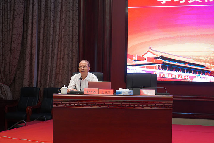 莊春賢以“牢記初心擔(dān)使命,砥礪奮進(jìn)新征程”為題,從“深刻領(lǐng)會(huì)習(xí)近平總書記”七一“重要講話的重大意義,切實(shí)把學(xué)習(xí)貫徹講話精神作為一項(xiàng)重大政治任務(wù)抓緊抓好;全面把握習(xí)近平總書記”七一“重要講話的豐富內(nèi)涵,深入理解講話提出的一系列新思想新觀點(diǎn)新論斷;準(zhǔn)確把握習(xí)近平總書記”七一“重要講話的實(shí)踐要求,縱深推進(jìn)新時(shí)代贛南蘇區(qū)振興發(fā)展“三個(gè)方面”,通過引用偉大的革命先驅(qū)為中華民族的偉大復(fù)興而奔走奮斗的英雄事跡,深刻闡釋了偉大建黨精神譜系和以史為鑒、開創(chuàng)未來”九個(gè)必須“的根本要求,對(duì)習(xí)近平總書記”七一“重要講話進(jìn)行了系統(tǒng)闡述和重點(diǎn)解讀。