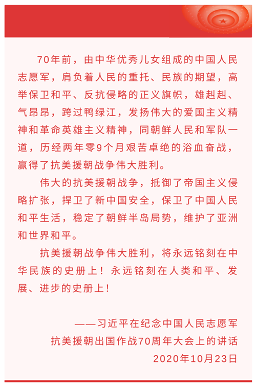 1950年10月8日,毛澤東發(fā)布命令,組建以彭德懷為司令員兼政治委員的中國人民志愿軍。19日,志愿軍雄赳赳氣昂昂跨過鴨綠江。這是以正義之師行正義之舉。中國人民志愿軍同朝鮮軍民密切配合,首戰(zhàn)兩水洞、激戰(zhàn)云山城,會戰(zhàn)清川江、鏖戰(zhàn)長津湖等,此后又構(gòu)筑起銅墻鐵壁般的縱深防御陣地,實(shí)施多次進(jìn)攻戰(zhàn)役,粉碎“絞殺戰(zhàn)”、抵御“細(xì)菌戰(zhàn)”、血戰(zhàn)上甘嶺,創(chuàng)造了威武雄壯的戰(zhàn)爭偉業(yè)。