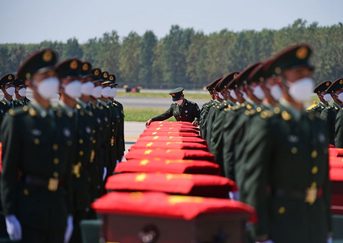 △2021年9月2日,在沈陽桃仙國際機(jī)場,禮兵在殮放志愿軍烈士遺骸的棺槨上覆蓋國旗。當(dāng)日,第八批在韓中國人民志愿軍烈士遺骸由我空軍專機(jī)護(hù)送從韓國接回遼寧沈陽,109位志愿軍烈士英靈及1226件相關(guān)遺物回到祖國懷抱。新華社記者 楊青 攝